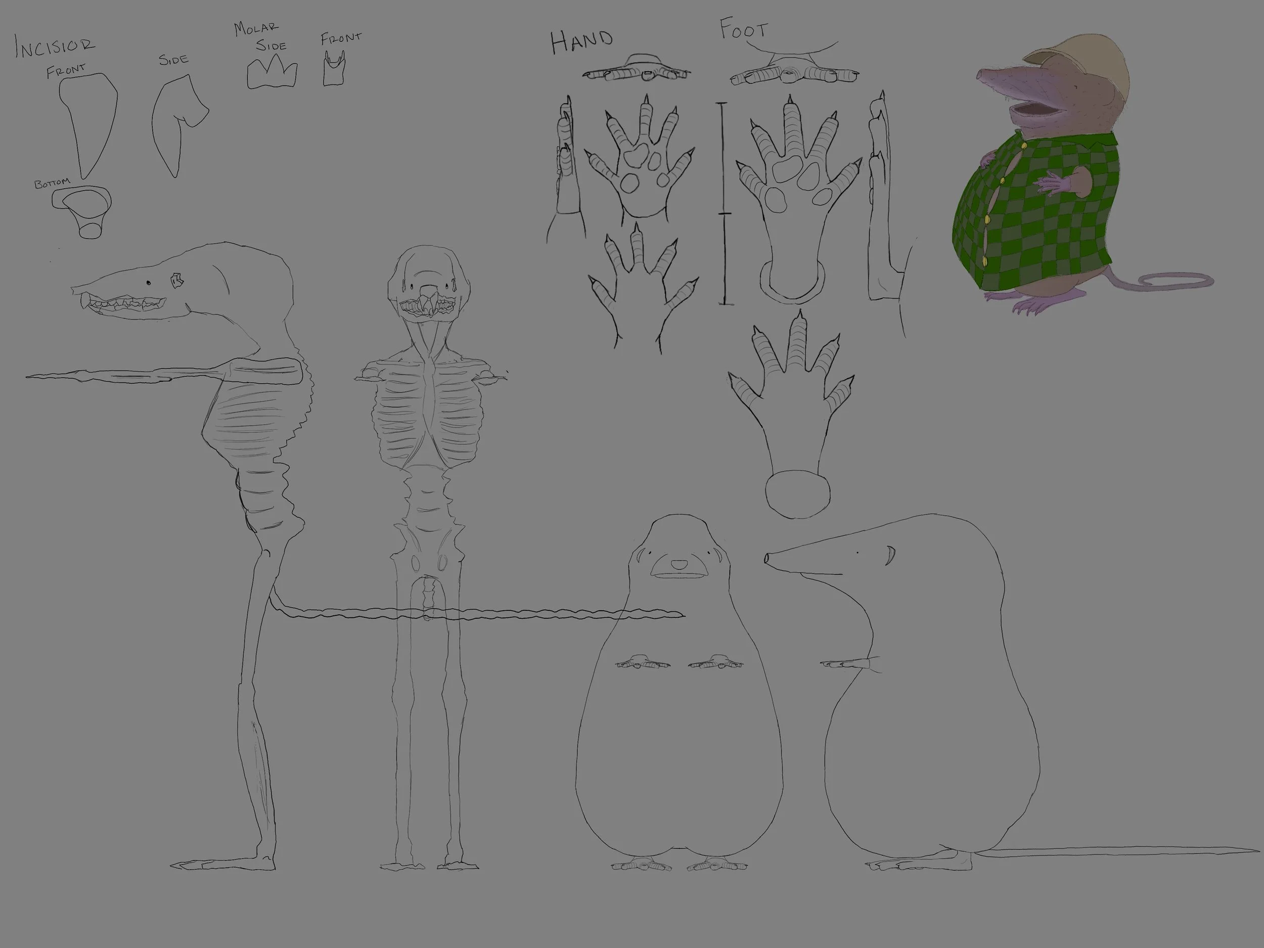 Although a lengthy process, I determined that actually modeling the skeleton and then modeling the outside skin of the shrew on top of it would make the proportions better, and make it easier to get ideas of where it could be interesting to emphasize the bone structure. I could also repose this skeleton for use in the regular shrew to make sure that the change in height was actually accurate between the two.