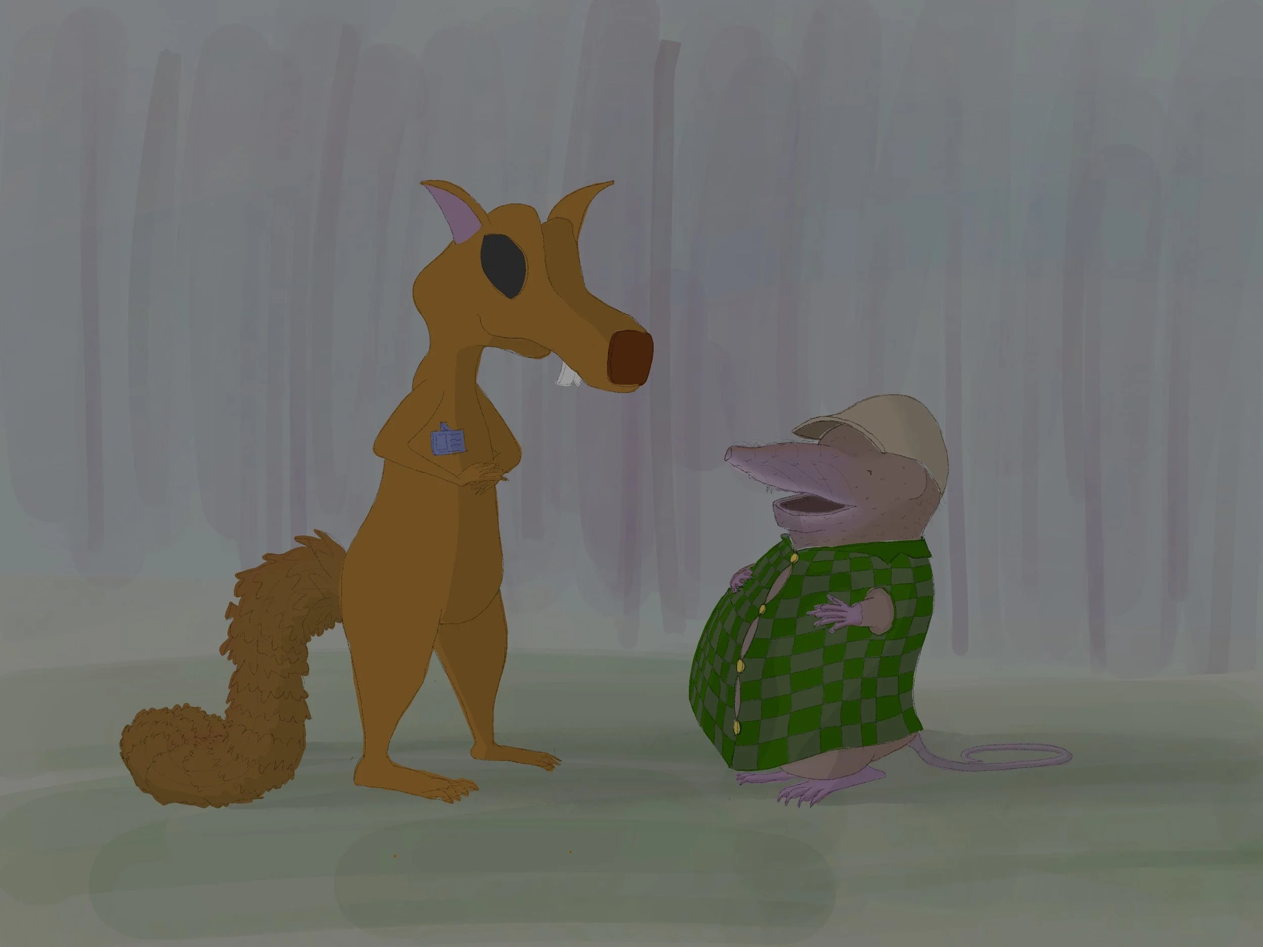 When it comes to characters I always start with a simple box model based off the concept art, and a simple rig to test proportions and general feel in 3D space. In this case I would be comparing and adjusting between the squirrel and both forms of the shrew. Even with accurate consideration of the legs fully extended, it just wasn’t enough to feel daunting next to the squirrel. I continued to push the length of the legs as far as would be reasonable, eventually getting to something closer to the leg-torso ratio of a human.