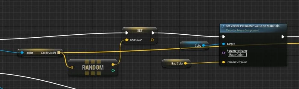 Here’s an example in a PlatformActor instance. If the random node’s output pin was connected to the Parameter value of the SetVectorParameterValueonMaterials, AND connected to a remove node, those two outputs would actually be two different random vectors from the LocalColors array. If you want to do multiple things with the same random query, you need to set it to a static variable that can be reused further in the execution line.