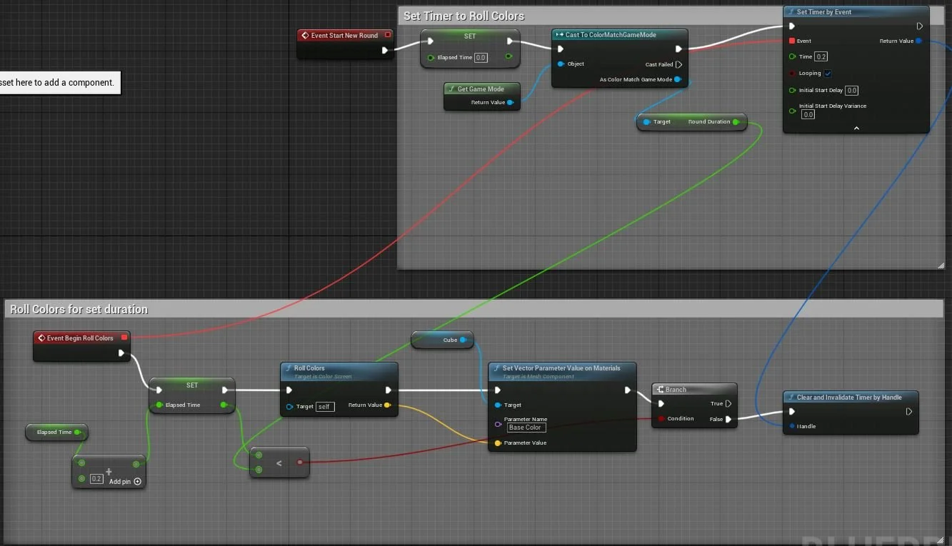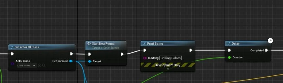 Here’s a snippet of the GameMode Blueprint. By using GetActorOfClass, you are able to begin event functions of other classes. StartNewRound is an event that takes care of the rolling effect of the color by manipulating the base color of the screen actor every .2 seconds (or whatever you’d like). The delay node is synced with the set time for the entire event to happen, so the moment a color is chosen, the platforms will be assigned their colors.