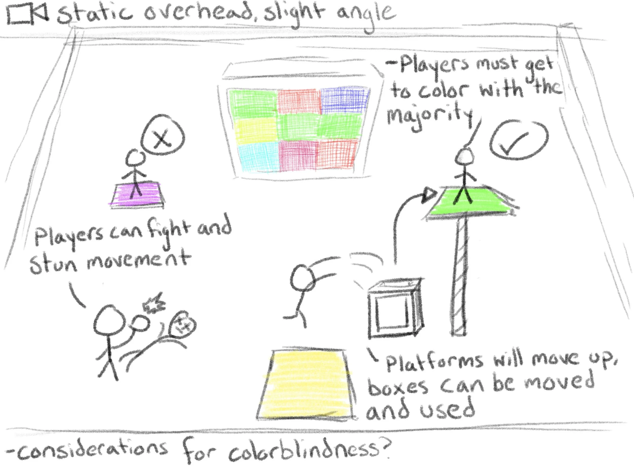 I try to identify the one sentence description of the game at the start. If your friend who has never played before asks what they need to do, what do you say? In this case, “the screen displays a color, get to the platform of the matching color.” Having a mission statement this simple is important to onboarding a new audience. In an infinitely complex game like League of Legends, the mission is simply “destroy the Nexus",” or, “destroy the other team’s base.” Although that says nothing about micro-mechanics or strategy, the new player has a goal in mind, and they will naturally develop ideas about how everything else works as they try and fail to win.