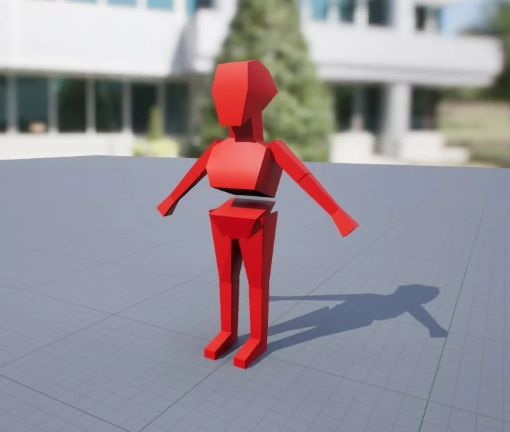 When I made a block model and test with a 5 head humanoid character, I was happy with the animations that I could make with it, and it was readable in game. The model that exists currently is a bunch of Maya primitive cubes merged together, and a solid color applied as a material to differentiate player slot.