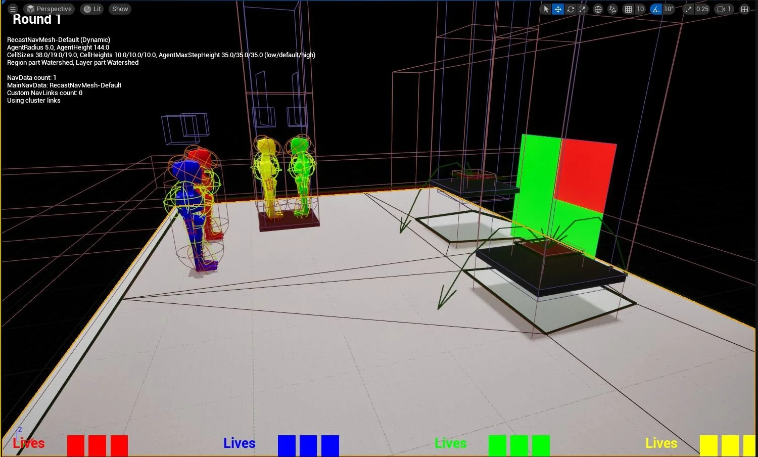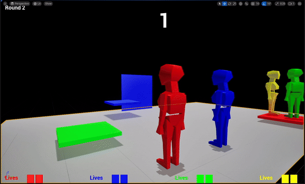 Then I restructured spawning of actors and how that was implemented in the GameMode blueprint. Based on data about players and control types collected from the UI, the game mode spawns and assigns to arrays references of HumanCharacter, ComputerCharacter (both children of my custom BaseCharacter), PlayerController, and AIController. When players lose lives or game over, their associated classes are destroyed and zeroed in an array, so that the game continues with the remaining players and the arrays hold their length for logic loop reasons.