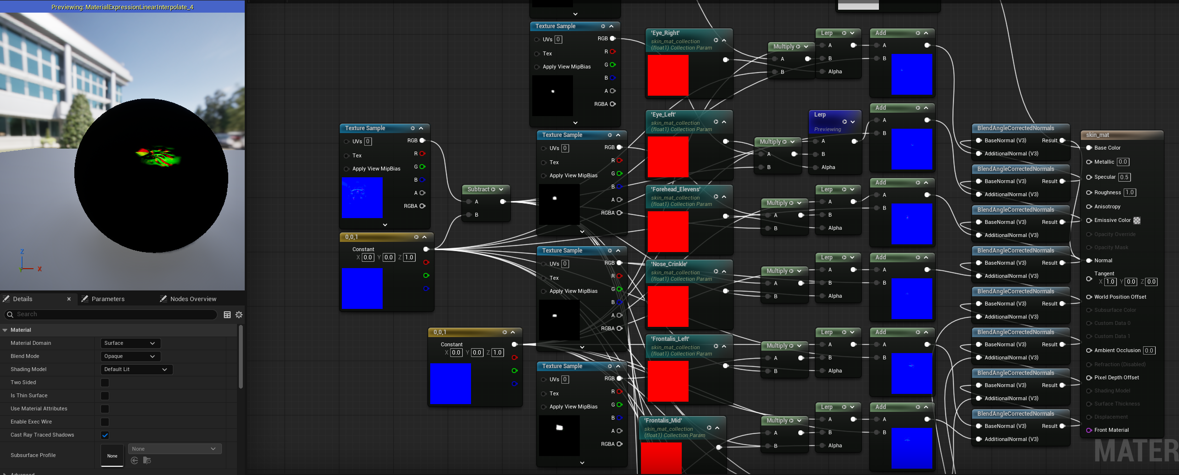 Getting this to work in Unreal Engine requires a few extra steps. Above is the material blueprint, which is similar to the Hypershade implementation. The only difference is I’m using BlendAngleCorrectedNormals as a replacement for the behavior of the layeredTexture node in Maya. You can’t directly access the joint data in the shader, so all of the masks are controlled by parameters in a Material Collection.