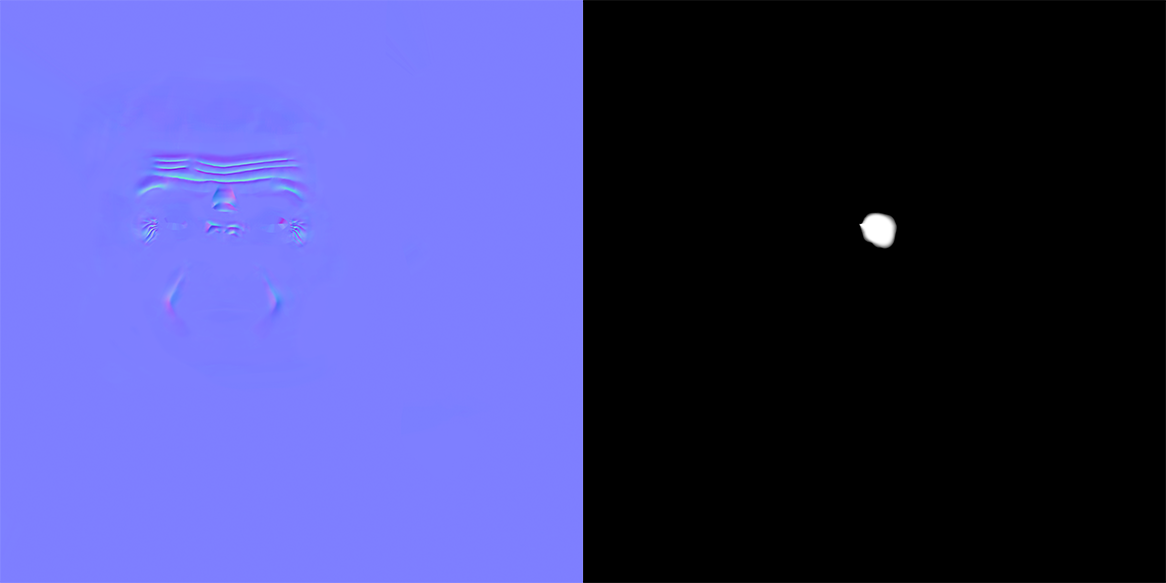 Above is the final normal map I am using, along with an example mask, the one used for the left crows feet. Each mask is controlled by a joint displacement parameter that blends them together when certain parts of the face deform.