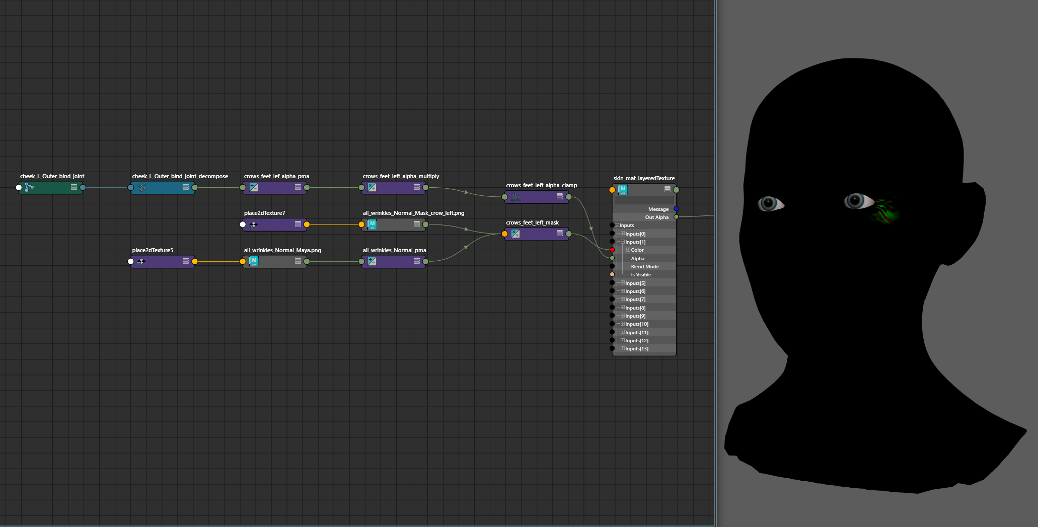 Although this character is going to render in Unreal Engine 5, I figured it would still be crucial for the animator to be able to see the wrinkles move while they worked, instead of having to guess and wait until the animation was brought to Unreal Engine. This can be done by subtracting out the blue channel of the normal map, and then driving the mask as an alpha in a layeredTexture node. An important note is that you will not get viewport feedback if you are using Parallel Evaluation. On the layeredTexture, I use a 0,0,1 map as the base, with None blending, and then each layer of masking is done in the Over blend mode.