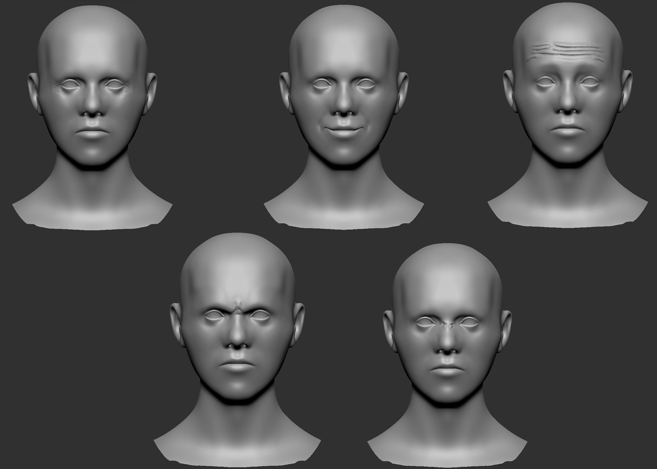 Before doing the wrinkles, I already had the base mesh sculpted, retopologized, and rigged. For each major wrinkle in the face, I articulated the closest joint in my rig in that area to its maximum, and then exported that static pose into ZBrush. The wrinkles that I determined most important are the frontalis wrinkles, the eleven lines, the scrunched nose, crows feet, and nasolabial folds. For some expressions, like disgust, it is almost unreadable without the wrinkling on the bridge of the nose.