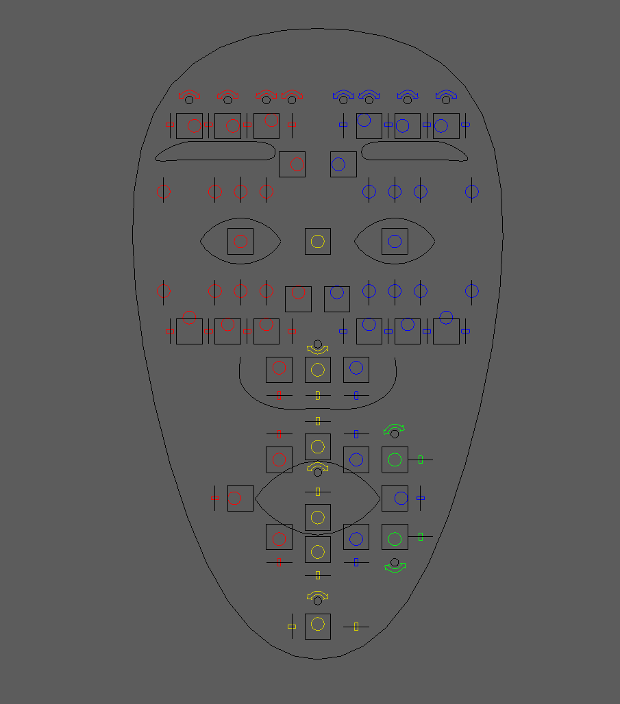 To help the animator along, I have created this GUI that is in full control of the shapes on the face. The eyebrow control on the top for example, allows the animator to get a quick raise, furrow, twist, or jutt of each of the three joints on the brow individually or all together. When the brow control translates positive in Y, it is actually rotating the corresponding joint around a pre-defined pivot point. This makes it so when a joint’s default behavior should follow the contour of the face, the animator can quickly get the joint to move on that path, and respect the animation principle of arcs.