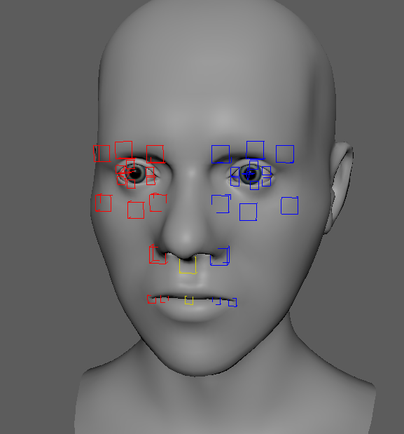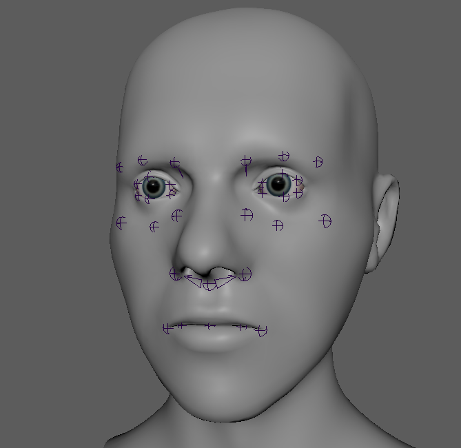 The joints pictured above allow the rig to hit the various movement types defined by Brian Tindall’s The Art of Moving Points. I am looking for a style that is lightweight but convincing in performance. The joints are laid out to the specifications of the three curve principle, which gives a lot more control than I need, but is great for finer tweaking. I’ve decided to keep the bind joints in world orientation, since tweak controls on the face start in world orientation, and creating arc movements for the GUI is easier when starting with clean data.