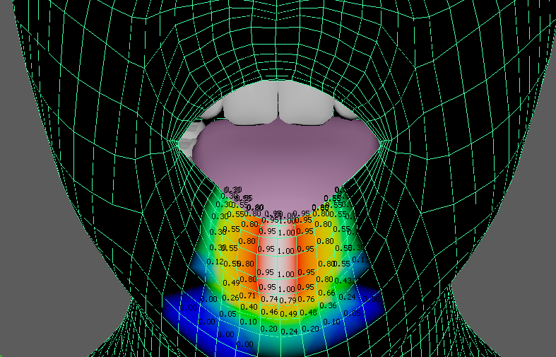 For the weights I started with a simple pass to define areas of vertices that I want to stick together, like shown on this Middle Lower lip joint. Once that is locked down, the actual deformation animation tests will show what needs to be rebalanced in the areas that are effected by multiple joint groups (upper lip and cheek, for example).