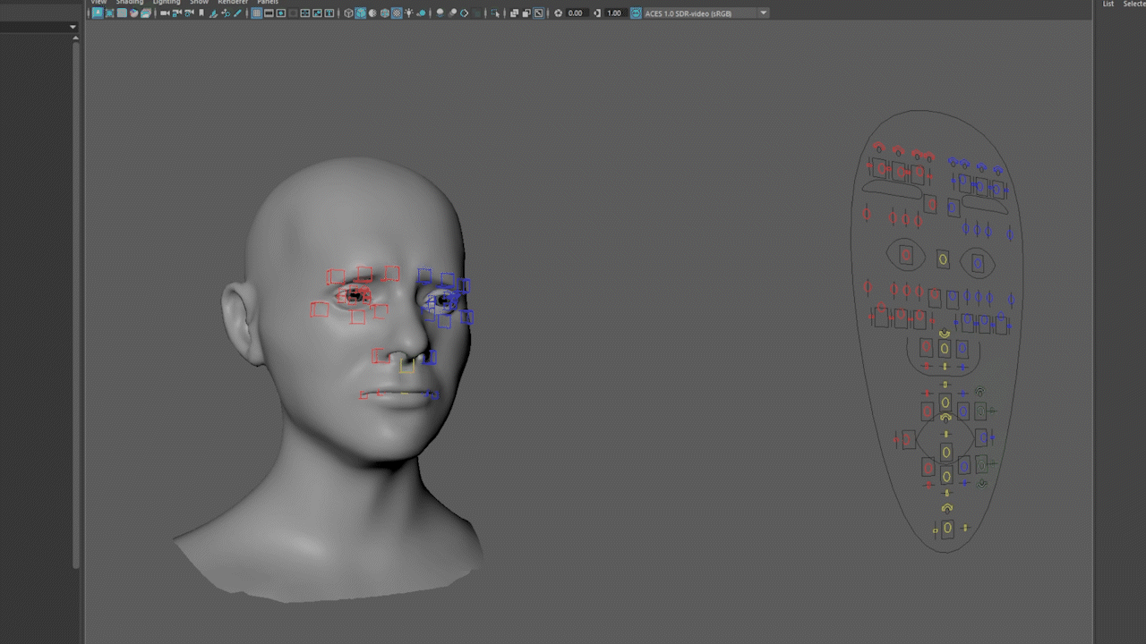 At the lowest level, each joint has an associated topological control that allows the animator to perfectly place that area of the face as they want without restriction. This is especially helpful when wanting to make final tweaks on top of the rotation curves I have built into the rig.