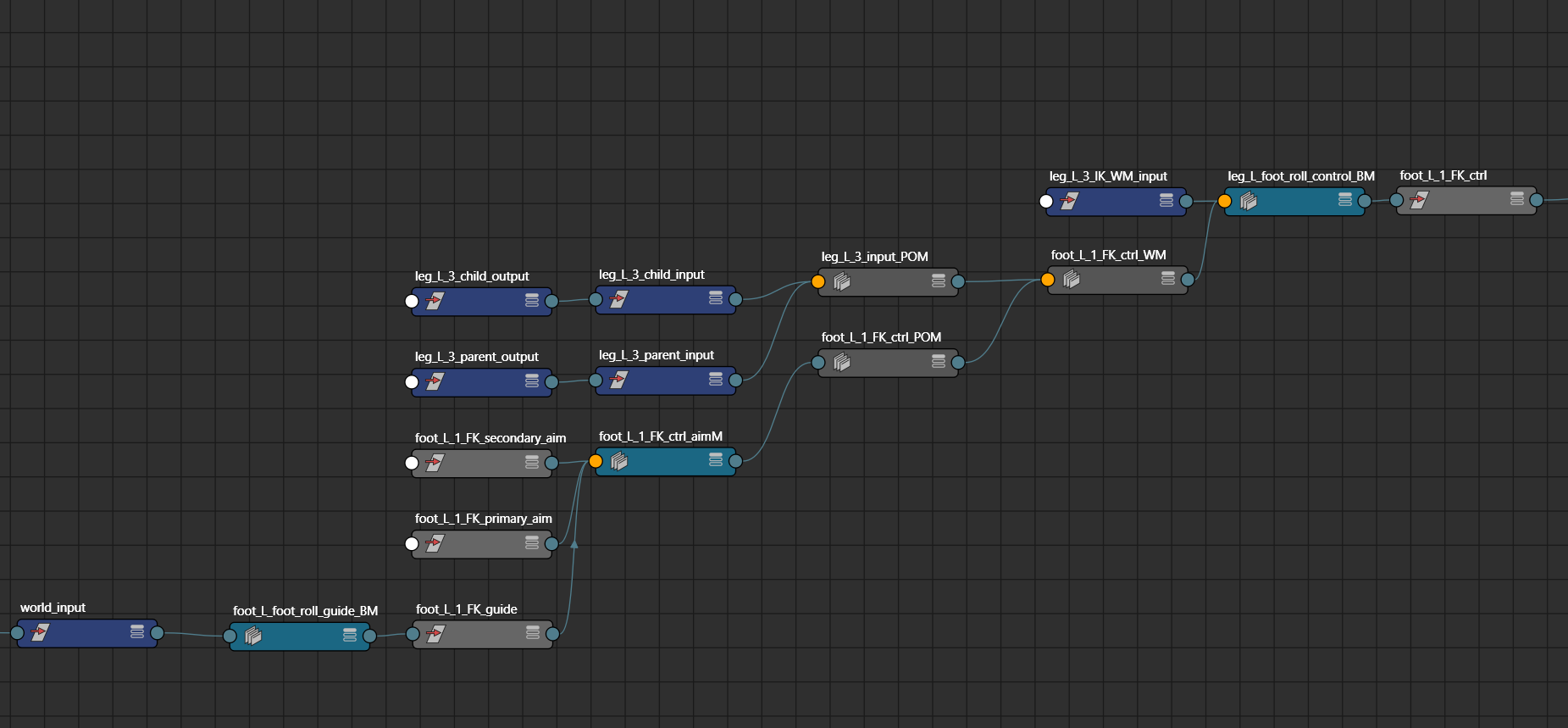 This is the first of what I am referring to as a “multi-module” feature in my pipeline. While an RP IK setup can fully exist within the data of the leg, a reverse foot needs to know joint and control transforms of the leg AND the foot. In order to respect private data access between modules, only the essential matrices are passed through buffer input and output nodes. Here’s how I integrate something like reverse foot into my matrix multiplication chain: