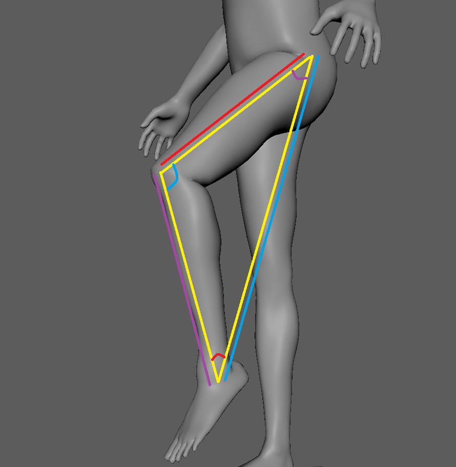 Essentially, our goal is to drive the Z rotation (assuming X down the bone) of each IK joint based on the lengths of the leg sides. Because the length from hip to ankle is variable, this will change our angle outputs and create the IK style system.