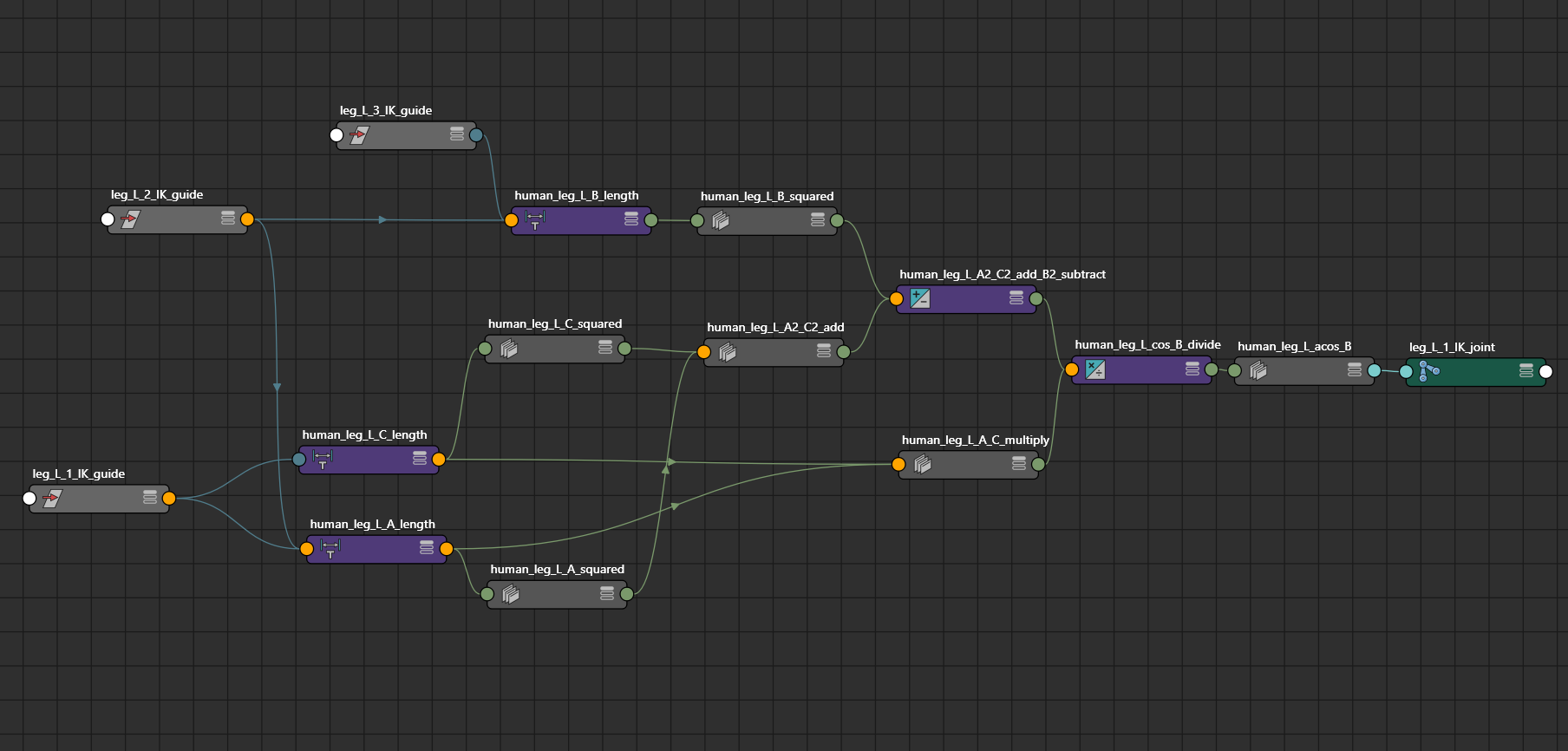 Although this looks like node spaghetti, at a basic level this graph is taking a locator at each joint position of the leg, applying the law of cosines, and finding the correct angle to apply to the joint’s Z rotation to satisfy the triangle.