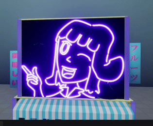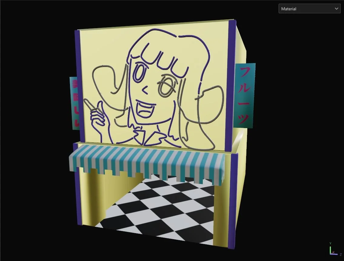 Towards the end of the week I was able to get some of the texturing done. I focused mostly on the main building, where I needed to make sure it matched the color palette, and the neon effect was convincing. Luckily, because the spirit of the design specifications is to stick with blocky colors, a lot of things like the fruit or mortar of the building could be simplified to just base color fills in Substance Painter. I still wanted to add a little bit of variety, and that would be done by introducing some pattern work.