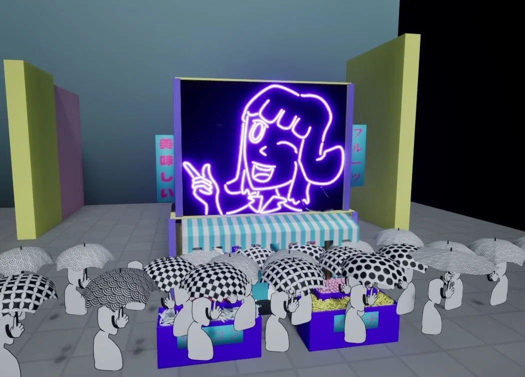 All that being said, for this project I settled for super simple lighting. With a directional light to simulate the sun, I adjusted it to give a diffuse, cloudy day look that ties in with everyone carrying an umbrella. I added a rectangular light to the interior of the main fruit shop, but the raytracing did a good enough job illuminating most of the scene. The final light is the emissive neon tubes, but this comes for free with simple settings on the static mesh.
