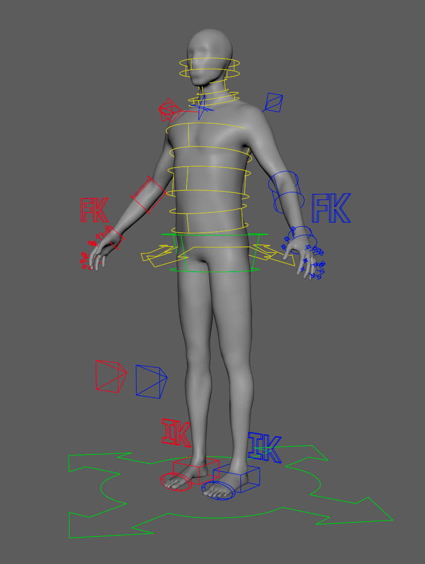 The tool is designed to give more bidirectional freedom to the user than Maya usually allows. If an arm is given the FK and IK features, a switch is automatically created for that module. If the user later wants to remove the FK feature, the tool responds to this by removing the FK and the switch, while leaving the IK fully functional.