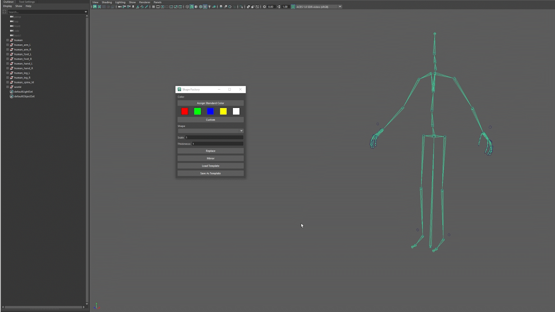 Feature systems created with the Module Builder leave temporary NURBS circles that can be replaced using the Shape Factory. The user selects one, and then chooses a base shape, a starting scale, and a line thickness. From there, the CVs can be transformed for additional design, and assigned a color. Shapes can be mirrored with the “mirror” button, respecting the shape and orientation, as well as assigning the color standard (red on right side, blue on left).