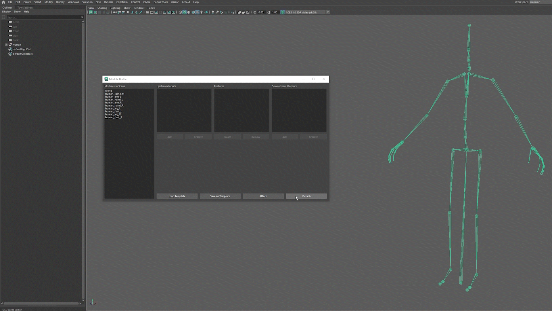 If the setup reaches a point that would make a good foundation for future rigs, the user can make a .json template file with “Save as Template.” This can be read by the UI later to call all of the same methods to make the same rig with the “Load Template” button.